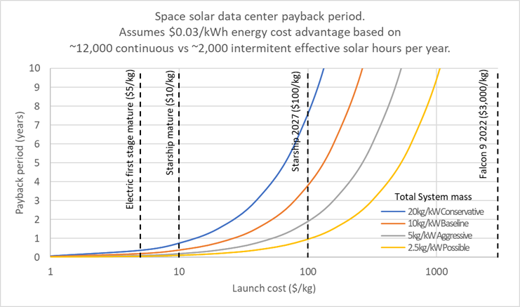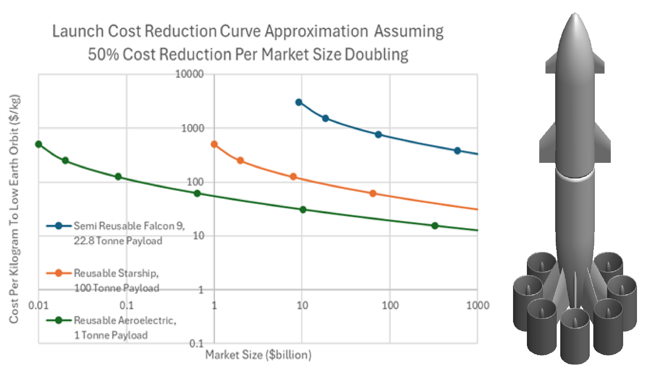 To first approximation, a 1 metric ton payload system can achieve the same flight rate and cost reduction as a 100 metric ton payload system at 1/100th the development cost and market scale. Aeroelectric first stages enable this, and while there are still some disadvantages associated with such small scales the same can also be said of much larger launch vehicle scales. At the 1 metric ton payload size an orbital rocket vehicle might have a dry weight as low as 1 metric ton and weigh around 20 metric ton fully fueled with payload. Aeroelectric first stages enable the complete re-envisaging of rocket vehicles and much higher payload fractions. The aeroelectric first stage might also weigh around 20 metric tons. Many different 1 metric ton payload launch systems using an aeroelectric first stage can likely be developed and achieve high launch rates and tipping point launch costs of around $100/kg within 2-3 years, and this might cost less than $100m per effort. Large fully reusable two stage rocket vehicles systems might be able to get to similar flight rates and cost reductions on this time scale, even though they are already decades and billions of dollars into their development and may have already had initial flight tests. The markets necessary to sustain the much larger launch vehicles and the higher flight rates needed may or may not eventuate on this time scale. This would require a ~100x increase in launch market total payload deliveries over the next 2-3 years. Assuming space based data centers this may actually happen, so this could be an interesting race. Given that the development, convenience, and cost reduction curve advantages of smaller aeroelectric first stage launch systems would not end there it would be expected that the larger two stage reusable rocket launch vehicles would lose the majority of the launch market soon thereafter. Or maybe they would adapt to use much larger aeroelectric first stages. Once the potential of aeroelectric first stages becomes apparent, including the consequences of being left behind in the new AI space race, billions of dollars in funding might become available. This would further accelerate the development of aeroelectric first stage enabled launch vehicles - maybe they will happen in less than two years.