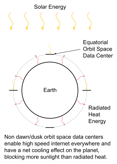 Space data centers in a dawn/dusk orbit are radially aligned with the Earth and are orthogonal to the sun. They do not block sunlight from hitting the Earth and have a reduced impact on blocking radiative heat from leaving the Earth and blocking observation of the night sky. Due to partial blockage of heat radiating from Earth dawn/dusk space data centers will have a slight net warming impact on Earth. Like existing low earth orbit satellite constellations, space data centers can cover other orbits for more direct low latency coverage of the Earth. This results in substantial thermal cycling on the space data center and requires increased solar area and the use batteries, which might be cycled roughly every 90 minutes to 120 minutes in a low Earth orbit. These space data centers will block sunlight, and to a lesser extent heat radiated from the Earth, such that their net impact will be to cool the Earth. Although installed space data center capacity would need to be in the hundreds of terawatts to have a substantial impact, which at a one year doubling rate would be around twenty years away. Depending on orbital height, if they are less than around five kilometers in diameter, or around 4GW, they will not cause a full eclipse - they will not fully block the sun on any location on Earth. This is because the sun is not a point source and is around half a degree across as viewed from the Earth. These membrane space data centers are not radially aligned with the Earth and require rigid structure or slow spinning in order to maintain their planar shape against Earth’s gravity gradient.