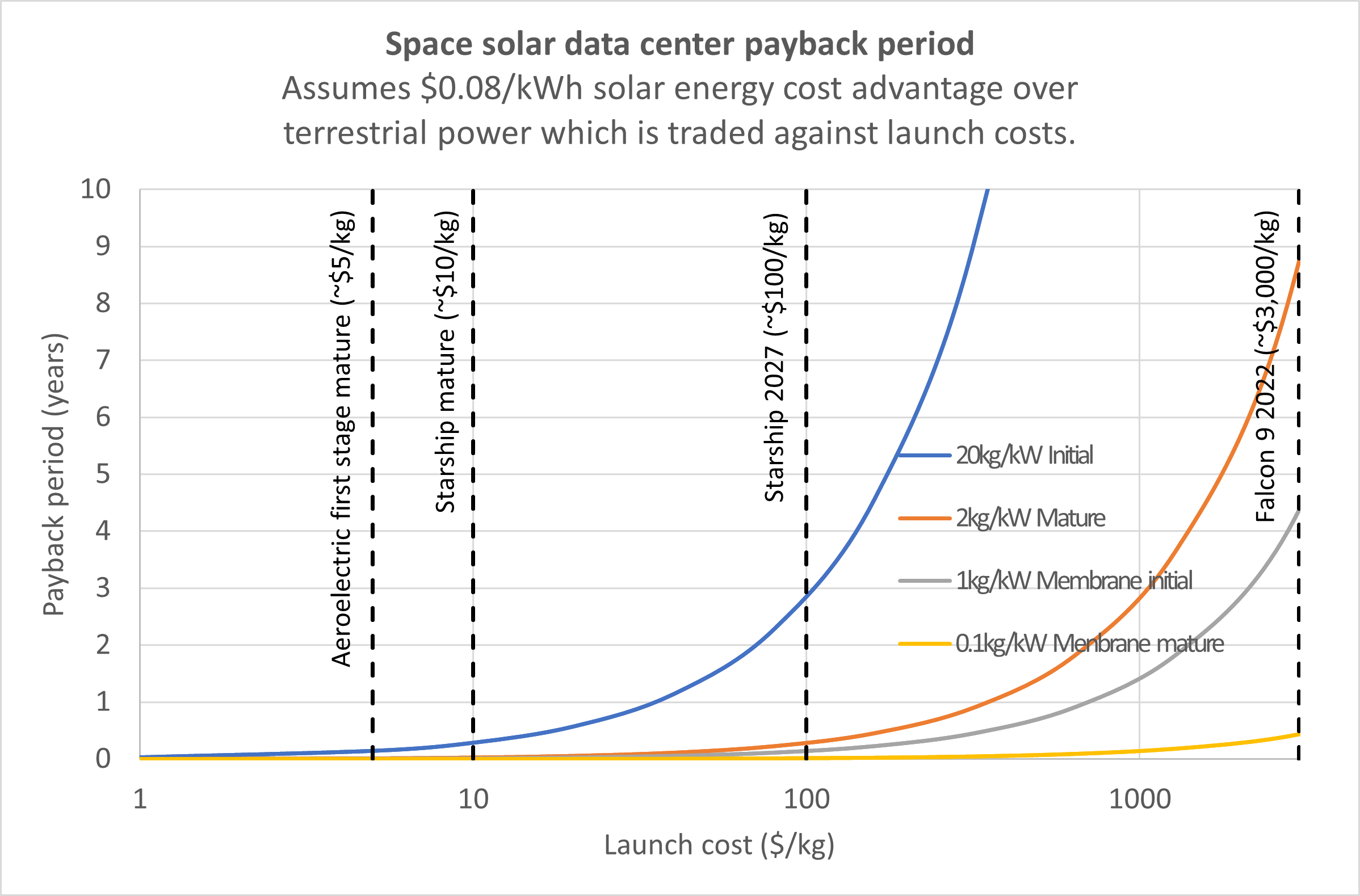 There is a small chance that a much smaller and more cost effective aero-electric first stage launch vehicle could still get to the tipping point first, if development and scaling began immediately. But the entire industry might switch to aero-electric launch regardless due to the many advantages of doing so, and perhaps not least because the inherent failure rate of two stage rockets are more than twice that of aero-electric launch systems, which are more akin to a single rocket stage rocket from a safety perspective. Much lower weight thin film space data centers might change the launch economics dramatically, but scaling rate dominance will still necessitate very high flight rates and favor low-cost launch. One way or another the current launch industry will transition to much safer, more dependable, lower cost, and much higher flight rate launch logistics systems that are perhaps more reminiscent of air freight.