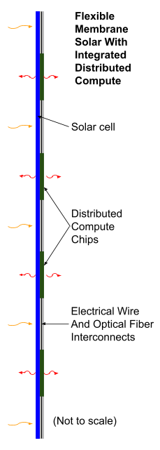 Ultimately it would be desirable to distribute the compute in a highly homogeneous manner over the solar array so as to minimize hot spots and mass. This reduces the need for chip heat spreaders, which might be constructed from copper, aluminum, graphene, vapor chambers, or like, that can increase weight and cost. It is also possible to intermix computer chips and solar area, not having the membrane be completely covered in high emissivity solar area, as the total area of the data center membrane may not be that constrained and this increases total cooling. Not having solar area integrated with the computer chips and their heat spreaders increases the effective cooling capacity available to the computer chips. For example, the data center membrane might have say 75% solar coverage with the other 25% being covered by computer chips and their associated heat spreaders interspersed with the solar area, with appropriate selective emissivity coatings over the heat spreaders which could potentially be as simple as a greenhouse film. In some scenarios heat spreaders might be inflatable vapor chamber heat pipes, for example, using aluminized mylar or like. This enables very lightweight, low-cost, and compliant heat spreading, although there are leakage and longevity issues. This general approach enables the use of cell phone sized chips and also chips much smaller and much larger than this. Hailo chips also appear interesting. Graphene and vapor chamber heat spreaders are already used in cell phones, but ideally more smaller chips reduce the total mass and cost of heat spreading. Ultimately it might be desirable to integrate compute directly into a thin film surface, largely eliminating the need for heat spreaders.