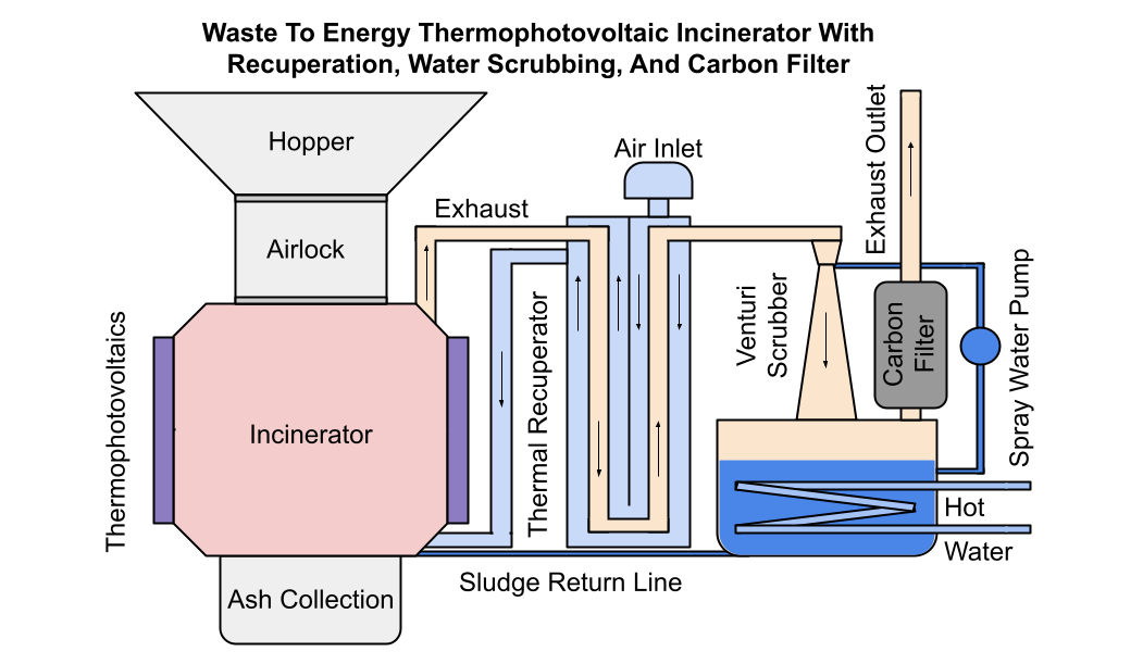Recent advances in thermophotovoltaics enable the construction of long-lived low-cost solid state backup generators with greater than 30% overall efficiency. This efficiency is likely to continue to improve. This enables direct waste to energy conversion in a highly distributed manner. Unlike steam turbines which need to be on the order of 50MW or larger to be efficient, the efficiency of thermophotovoltaics is largely independent of size, allowing for small efficient generator units. At around 1,500℃ the radiative energy intensity is almost 1,000x that of sunlight on Earth, and a very small area of solar cells is needed to generate very high power outputs. This suggests that very low cost thermophotovoltaic cells, perhaps even less than $10/kW, are achievable even with higher cost indium gallium arsenide phosphide (InGaAsP) cells. Balance of system costs will dominate.